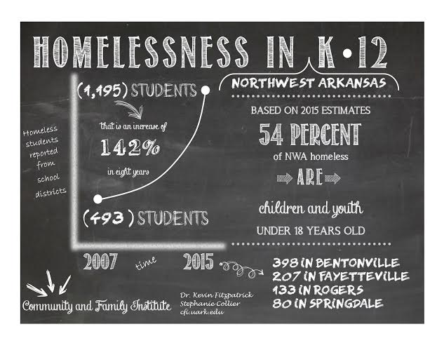 How surprising is it that over half of the homeless counted in the Northwest Arkansas 2015 point-in-time homeless census (PIT) are K-12 students? Over 1,200 students are without a place they can call their own on any given night throughout the year.